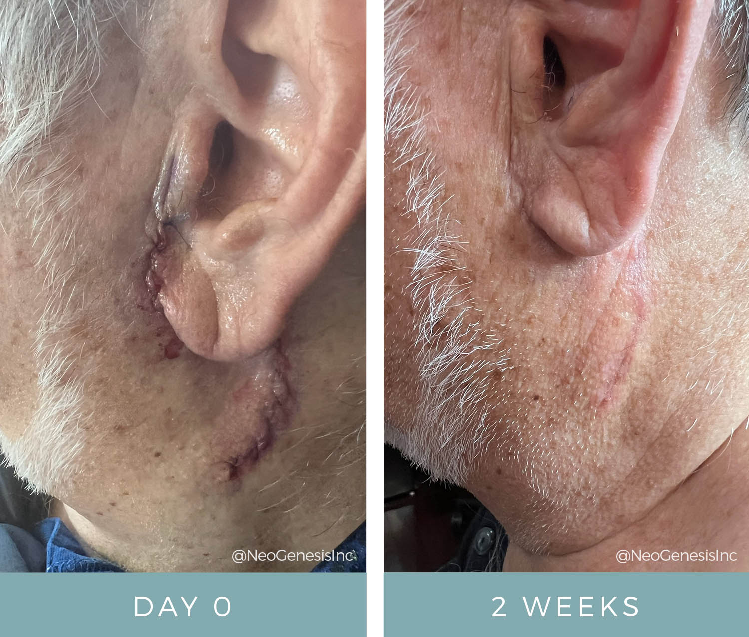 “I had a second chance to “test” the (Recovery) product when a PET scan identified a benign tumor in the area of my left parotid gland, and I underwent surgery to remove it. The procedure left a nasty incision around my ear and extending an inch or so down to my neck. I applied NeoGenesis Recovery serum daily immediately post-surgery, and within a week my incision was hardly noticeable.